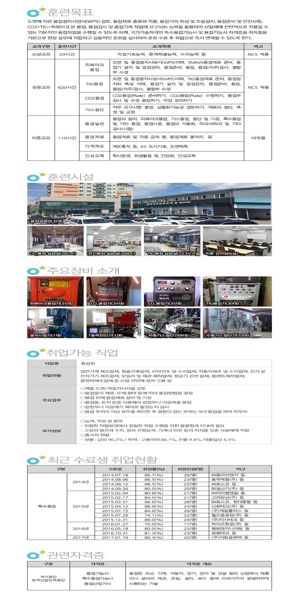 | CO2용접 | 50시간 | 플럭스코어드와이어용접 작업 | 1. 플러스코어드와이어용접 조건 설정하기 2. 플러스코어드와이어 선택하기 3. 플러스코어드와이어용접 보호가스 선택하기 4. 플러스코어드와이어 용접하기 |