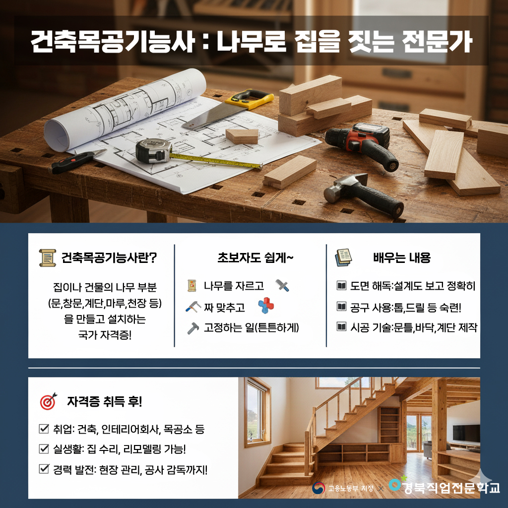 건축목공기능사는 한국산업인력공단에서 시행하는 국가기술자격증으로, 건축 현장에서 목조 건축물을 시공하고 유지보수하는 데 필요한 기술을 평가하는 자격입니다.